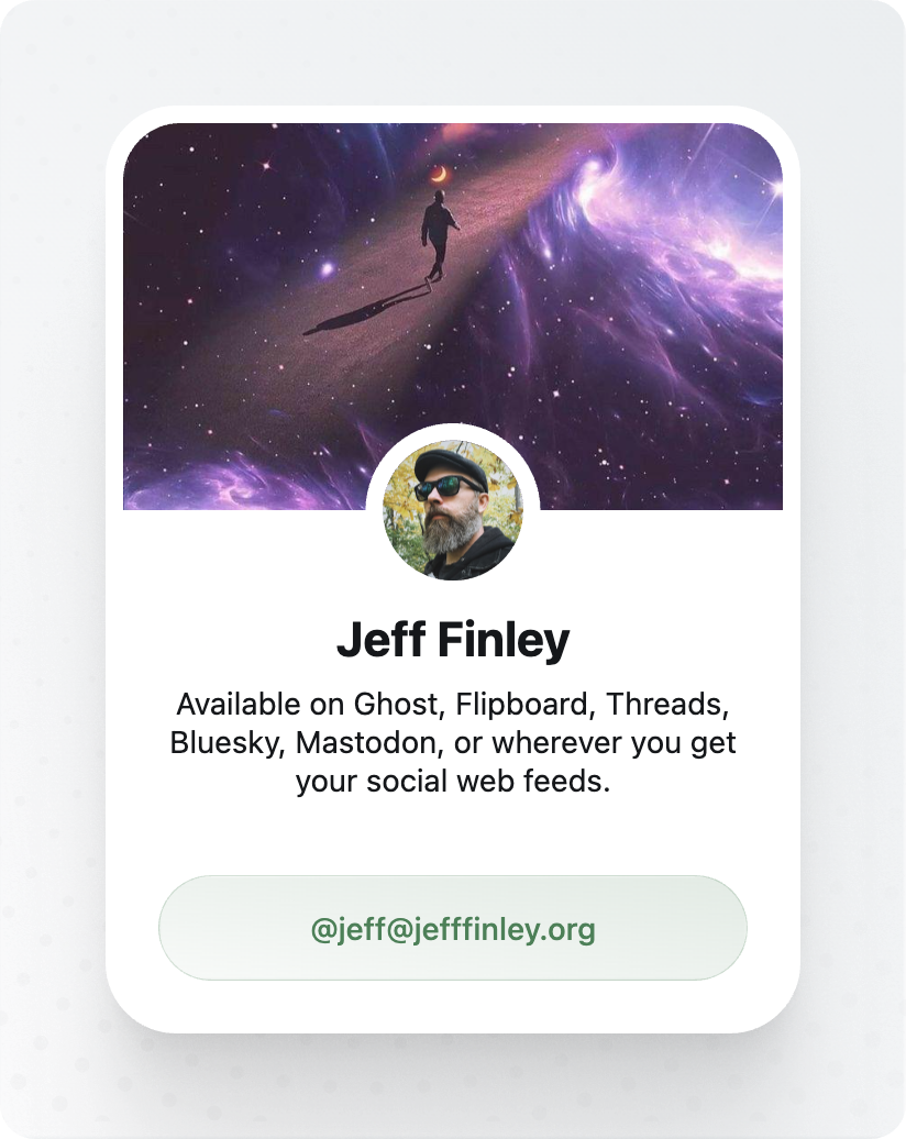 I'm new to this, but if you're on Ghost, Blue Sky, Threads, Mastodon (or any Fediverse platform) you can follow my blog just like you’d follow a person. Every time I post something new here, it’ll show up in your timeline.