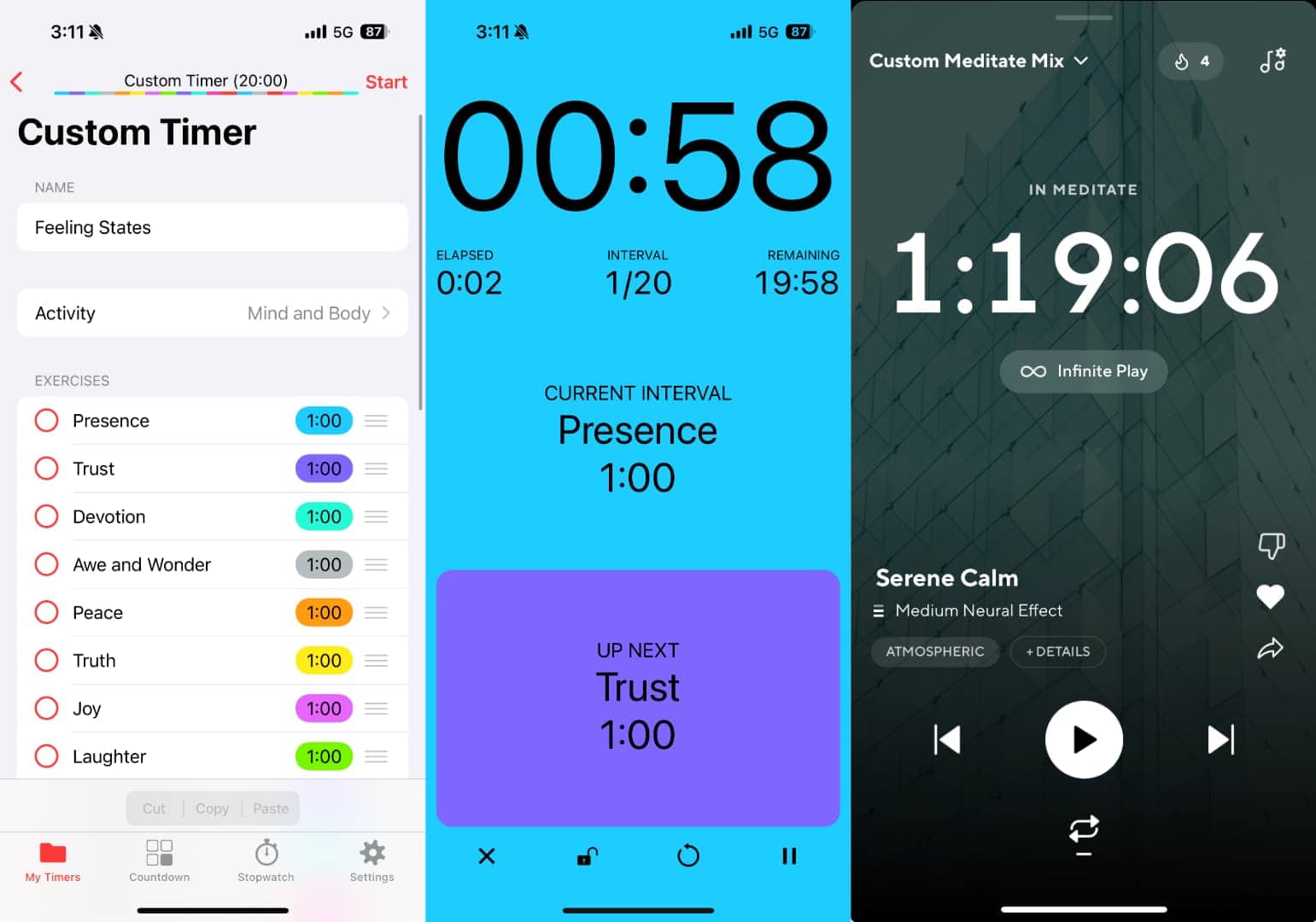 - Alternative setup in any timer app: Use an interval timer app of your choosing. Add each feeling state as an "exercise" and set the duration for one minute each. If you have text-to-speech enabled, use that. Feel free to change settings as you see fit.